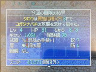 杖の識別を誤る 投稿日時: 2011年12月8日 投稿者: Tarou 返信 【原始に続く穴3F】 杖の識別は早めにしておきたいねということで、コイツにコノ距離で杖を振った。感電の杖だった。電撃を受けた直後蜂に刺されて倒れた。この距離では自分もダメージを受け、相手はギリギリ生き残る。(コガタナバチのHPは28、感電の杖のダメージは25) 杖の識別は距離を取れ、は基本であった。 最近混乱の手斧がよくでる。いい武器だが、まったく活かせてない。 共有:TwitterFacebookGoogle