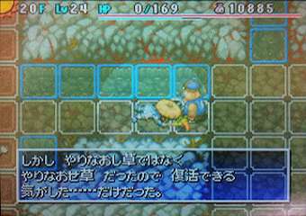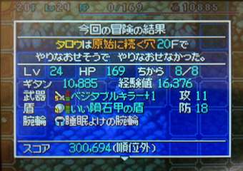 こつこつマゼルンで合成したり、アイテム識別が順調だったり、極めて地道に進んでいたところだった。20Fで店を見つけて店主とのまっとうな売買に勤しんでいたところ、どうもボウヤカートが遠くからウザい。一旦通路で倒そうと、サッと斜め移動したら、こうだ。
