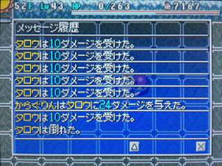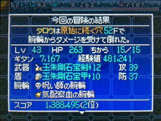 HPが少し減っている状態で歩いていると、遠くから飛んできたのだ、狂戦士の種が。たまらんガッパ…。結局そのカッパは倒したものの、次の部屋の遠いところにいたからぐりんを追いかけ、気配察血の腕輪のダメージが積み重なり、倒れた。